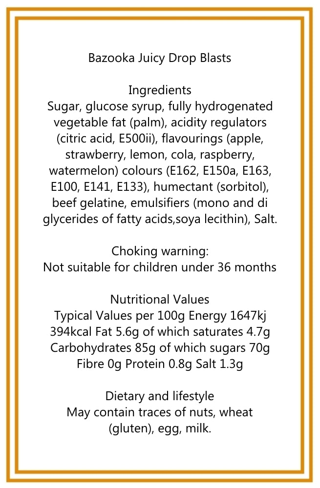 Get ready to tantalize your taste buds with Bazooka Juicy Drops! These chewy fruity sour sweets are the perfect treat for anyone who loves a burst of flavour. Each bag is filled with an assortment of randomly picked flavours, including zesty Lemon, tangy Raspberry, sweet Strawberry, crisp Apple, and refreshing Watermelon.