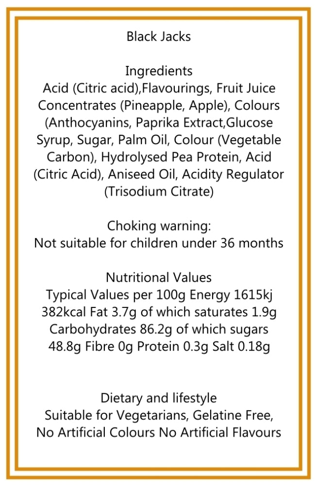 Sirop de glucose, sucre, huile de palme, colorant (carbone végétal), protéine de pois hydrolysée, acide (acide citrique), huile d'anis, régulateur d'acidité (citrate trisodique). Conseils en matière d'allergie Fabriqué dans une usine qui manipule des œufs, du gluten et des noix. Peut avoir des effets indésirables. effet sur l'activité chez les enfants