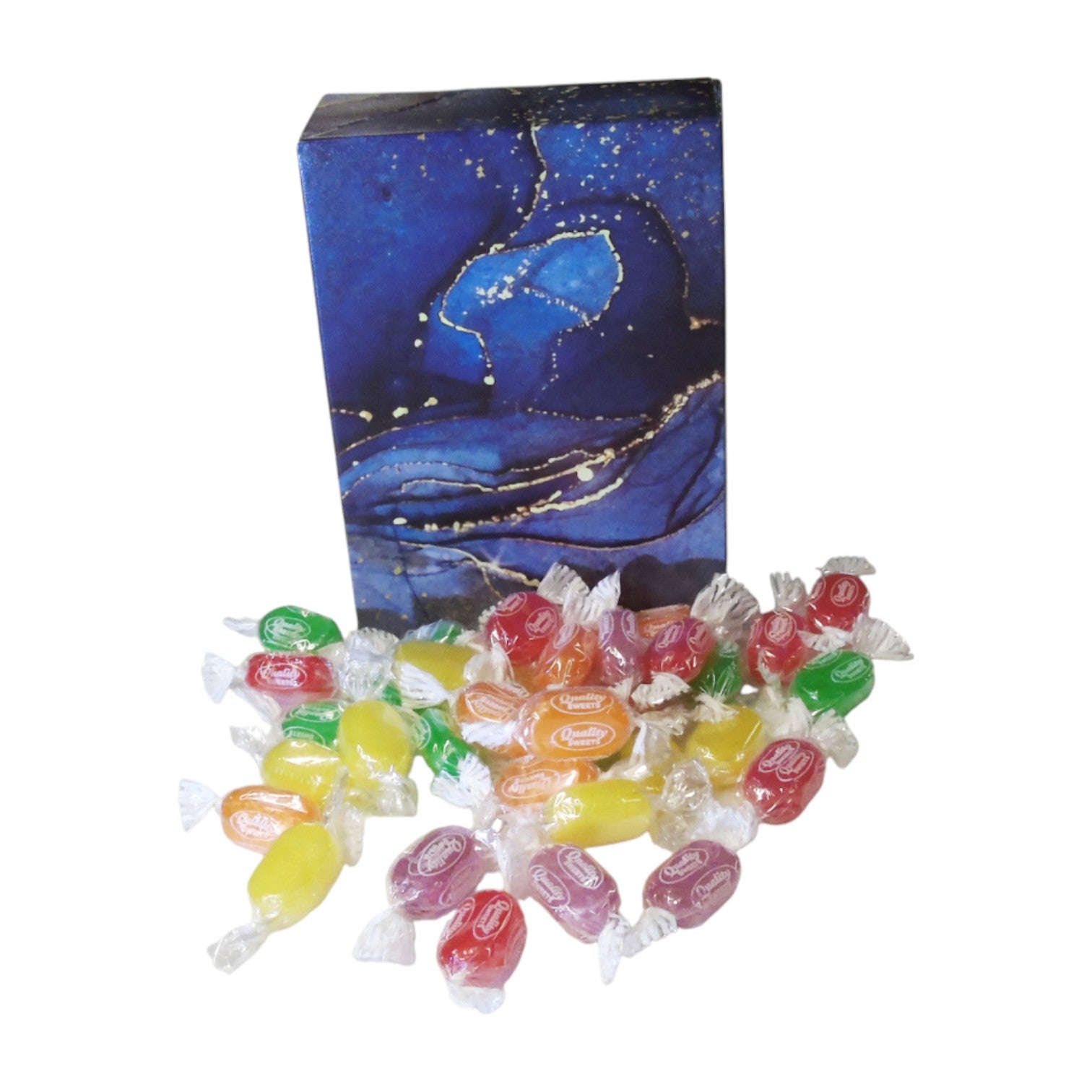 window box features a beautiful paisley pattern and is filled with a selection of individually wrapped hard-boiled sweets. Each sweet is bursting with fizzy sherbet and comes in a variety of classic fruit flavours including Lemon, Strawberry, Orange, Blackcurrant, and Lime. The individual wrappers ensure freshness and hygiene, making these sweets perfect for sharing or enjoying on your own. The elegant packaging makes this box an ideal gift for birthdays, holidays, or any special occasion. Size (WxHxD) 17 x 4.8 x 12cm